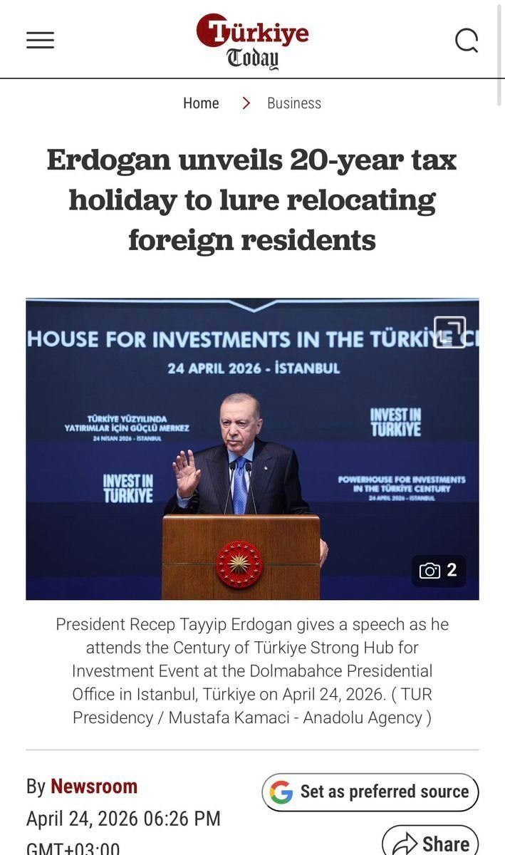 Лица, которые не являлись налоговыми резидентами страны в течение последних трёх лет и которые решат в неё переехать, не будут платить турецкий налог на свои доходы из иностранных источников и прирост капитала в течение 20 лет.