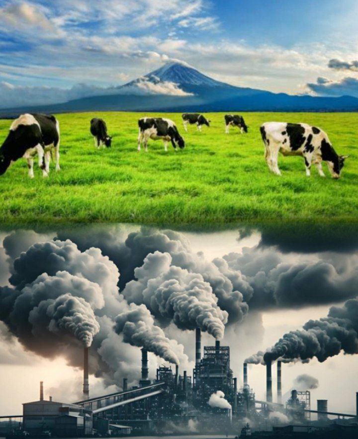 По мнению "великих" умов Фонда Гейтса, а так же Всемирного Экономического Форума, выбросы животных на картинке сверху наносят сильно больше вреда, чем фабрика с картинки ниже.