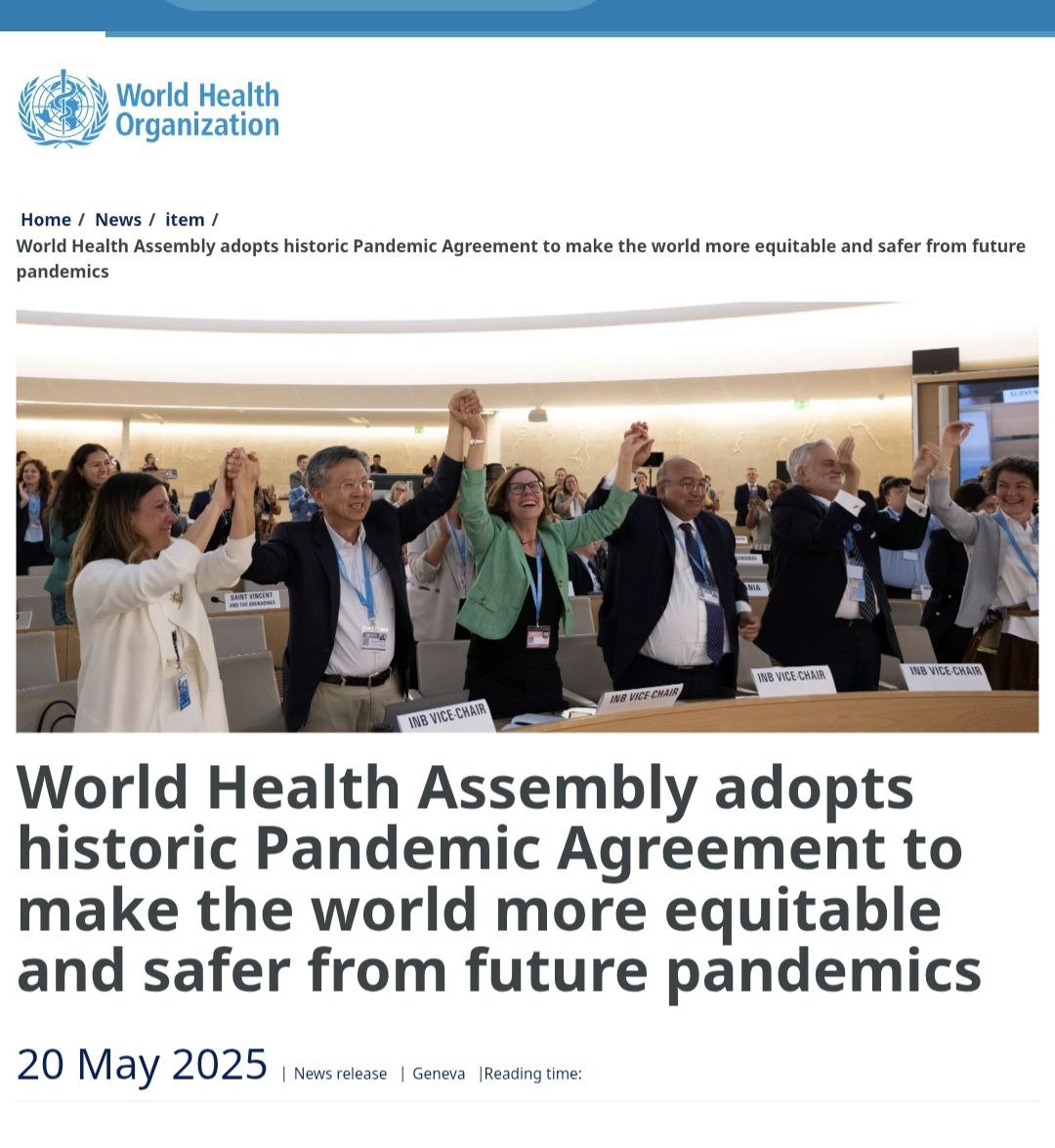 сегодня официально приняли консенсусом первое в мире Соглашение о пандемии. Историческое решение 78-й Всемирной ассамблеи здравоохранения является кульминацией более чем трех лет интенсивных переговоров, начатых правительствами в ответ на разрушительные последствия пандемии COVID-19 и направленных на то, чтобы сделать мир более безопасным от будущих пандемий и более справедливым в ответ на них.