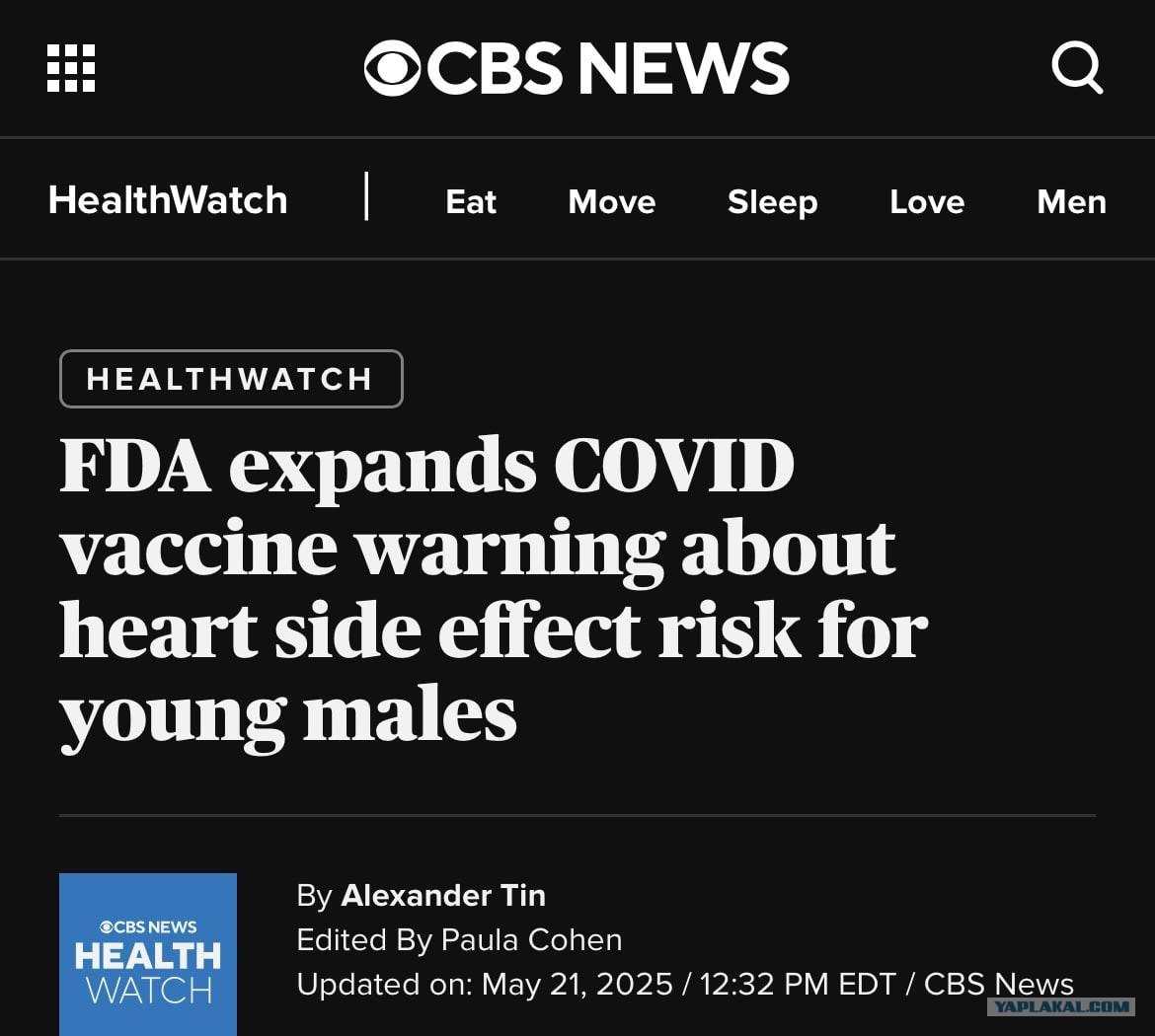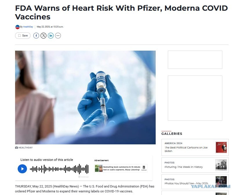 FDA от 22 мая 2025 года рекомендует производителям вакцин против Covid, Pfizer и Moderna, обновить предупреждающие надписи на этикетках, на которых указано, что вакцины могут вызывать воспаление сердца - миокардит и перикардит.