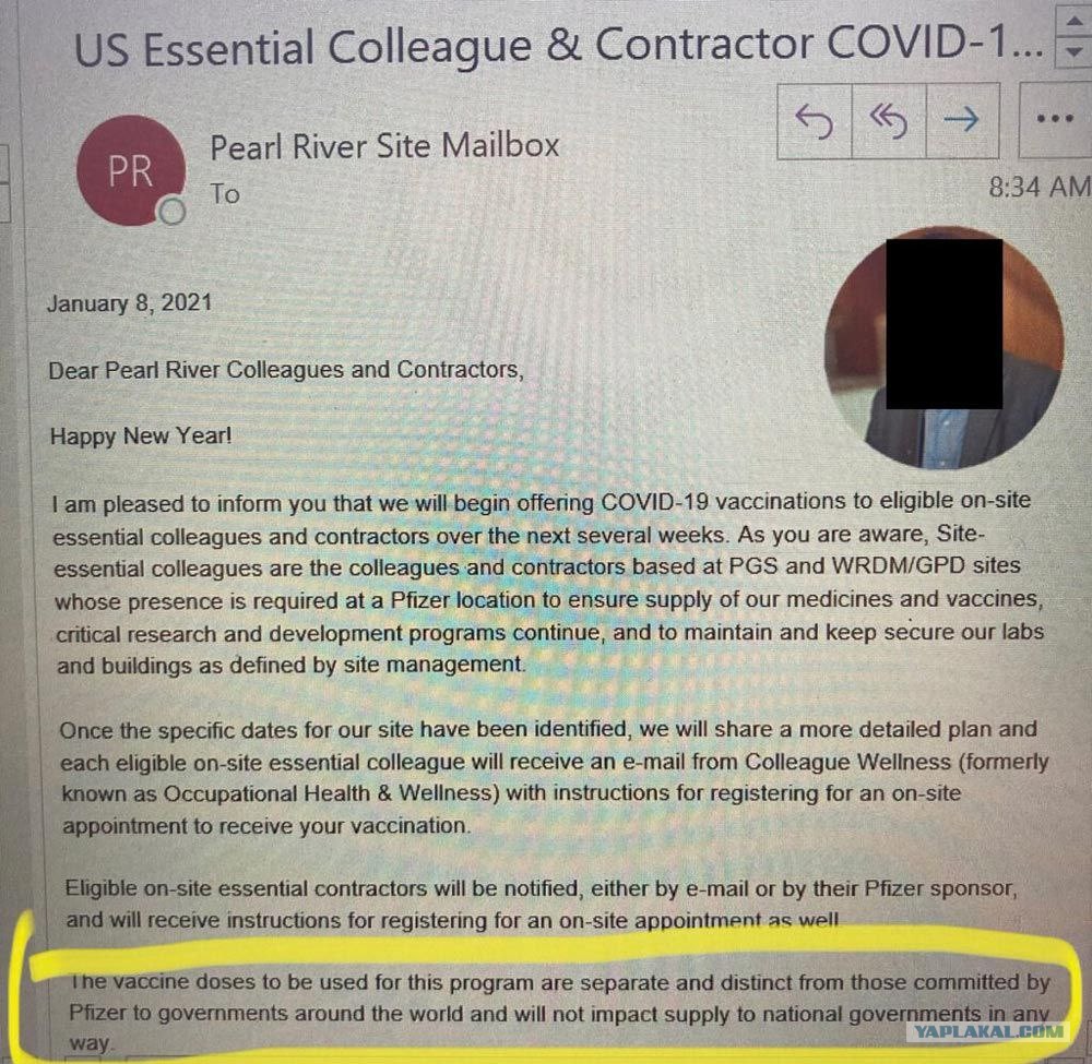 Я рад сообщить вам, что в течение следующих нескольких недель мы начнем предлагать вакцинацию от COVID-19 имеющим на это право основным коллегам и подрядчикам на местах. Как вам известно, коллеги, ответственные за работу на объекте, — это коллеги и подрядчики, базирующиеся на площадках PGS [Pfizer Global Supply] и WRDM/GPD [Всемирные исследования, разработки и разработка медицинских/глобальных продуктов], присутствие которых на предприятиях Pfizer требуется для обеспечения поставки наших лекарств и вакцин, важнейшие программы исследований и разработок продолжаются, а также поддерживать и обеспечивать безопасность наших лабораторий и зданий, как это определено руководством объекта.