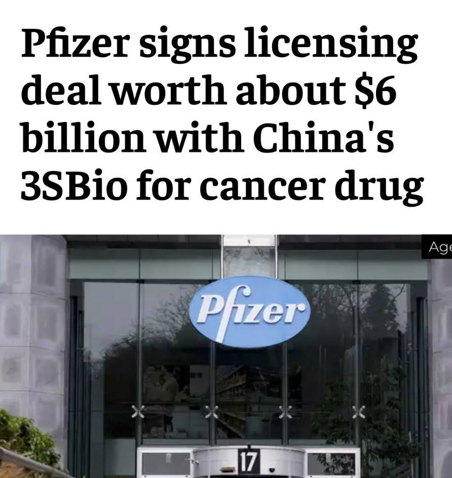 Компания Pfizer подписала соглашение на сумму 6 миллиардов долларов с китайской компанией 3SBio Inc. на разработку, производство и продажу препарата для лечения некоторых видов рака и опухолей.