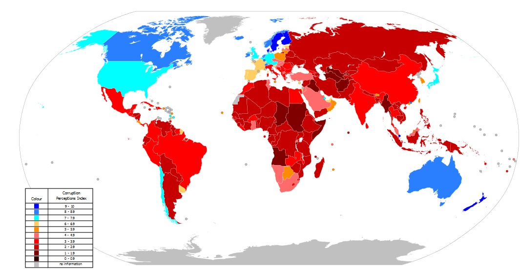 Красным отмечены государства с высоким восприятием коррупции, синим — с низким.