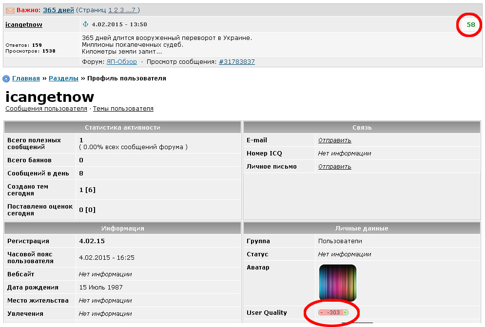 Так и есть. В профиле красных 304 (честные), а если открыть его сообщения, то этот пост набрал аж 58 зеленки (админских)