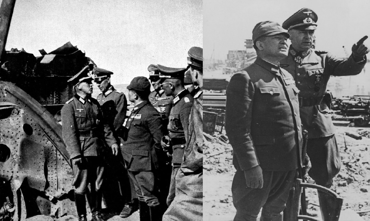 11. Немецкие и румынские генералы осматривают захваченную батарею. Кстати, интересно сравнить комплекции генералов противника с советскими военачальниками на соседней фотографии...