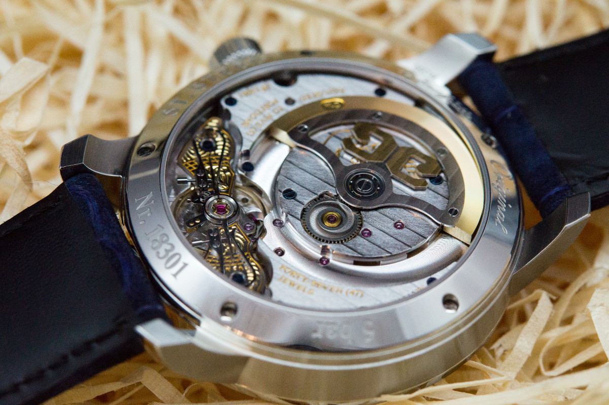 Cкелетонированный ротор, смещённый относительно центра, двойная буква "G" и ротор из 21К золота. Узор "солнечные лучи" на шестеренке - традиционный элемент для часов из Гласхютте. Двойной регулятор "лебединая шея" над мостами с ручкой гравировкой, отполированный до черного зеркала.