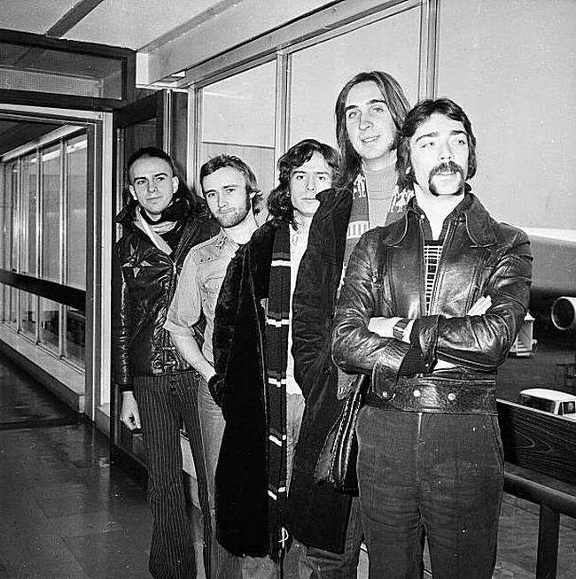 27 февраля 1974 года: британская рок-группа Genesis, (слева направо) Питер Гэбриэл, Фил Коллинз, Тони Бэнкс, Майк Резерфорд и Стив Хэкетт в аэропорту Лондона.
