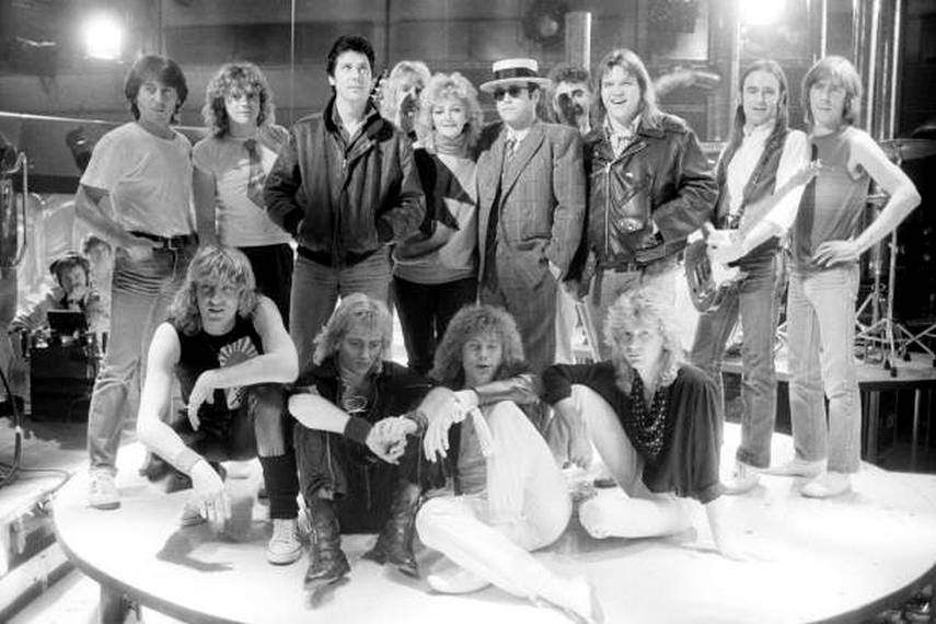 Исполнители Рождественского шоу Channel 4, групповой снимок, Великобритания, 12 декабря 1984 г .; включая Элтона Джона, участников группы Def Leppard, Meat Loaf, Бонни Тайлер, Shakin 'Stevens и Status Quo.