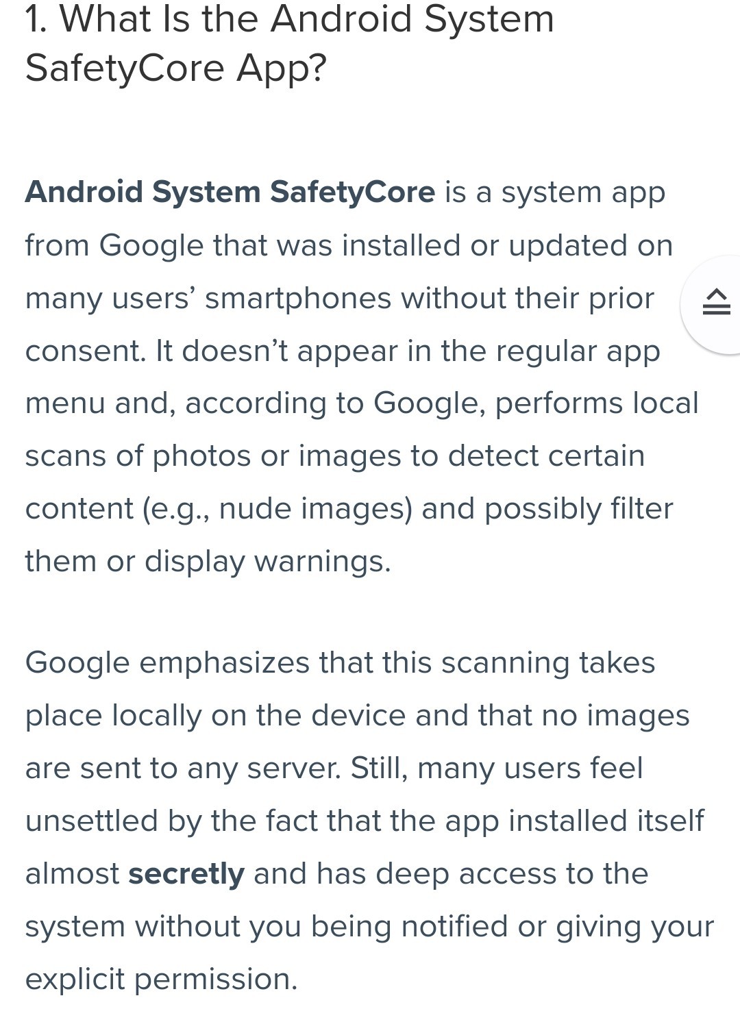 "SafetyCore is a new Google system service for Android 9+ devices that provides the on-device infrastructure for securely and privately performing classification to help users detect unwanted content. Users are in control over SafetyCore and SafetyCore only classifies specific content when an app requests it through an optionally enabled feature."