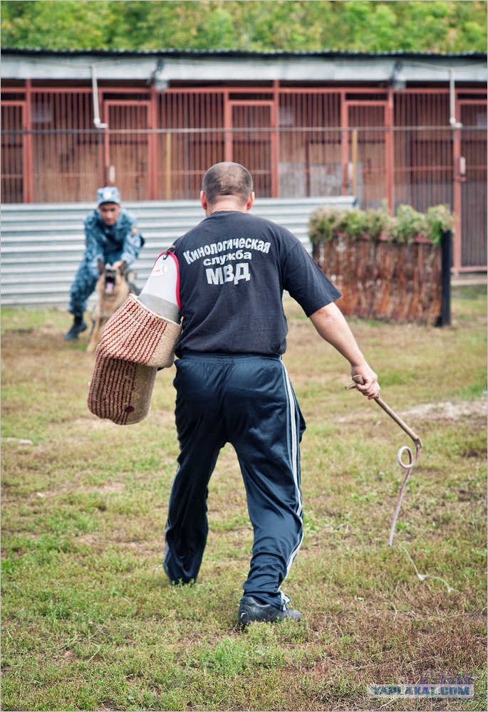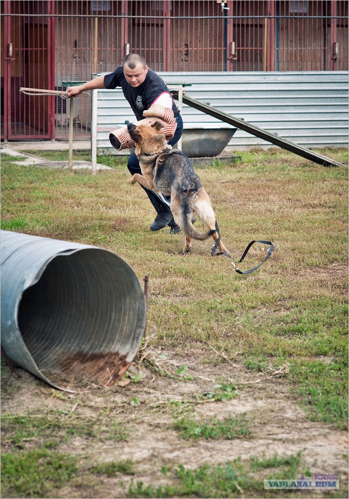 Задержание при помощи собаки, которое демонстрировалось собравшимся — оно учебное. «Фигурант» в защите, всё под контролем. В других, обычных обстоятельствах, собака при атаке может своим укусом загнать человека в болевой шок, обездвижить его и даже лишить сознания. Речь идёт, конечно, об экстренных обстоятельствах и о специально обученных собаках. В нашем случае после команды кинолога собака помогает конвоировать задержанного невредимого преступника.