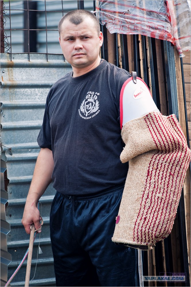 Перед тренировкой по задержанию условного преступника журналисты были предупреждены о том, что собаки будут на задержании вести себя агрессивно, не надо её отвлекать и провоцировать. Если собака подбежит, не стоит орать, прыгать, махать руками. Собака обучена таким образом, что не представляет угрозы для человека, который замер и молчит. При необходимости собака может «клюнуть» неопределившегося гражданина — т.е. ударить, например, по руке открытой пастью, не прижимая зубами. Желающим было предложено примерить дрессировочный костюм и попробовать себя в роли «негодяя». Таковых не нашлось.