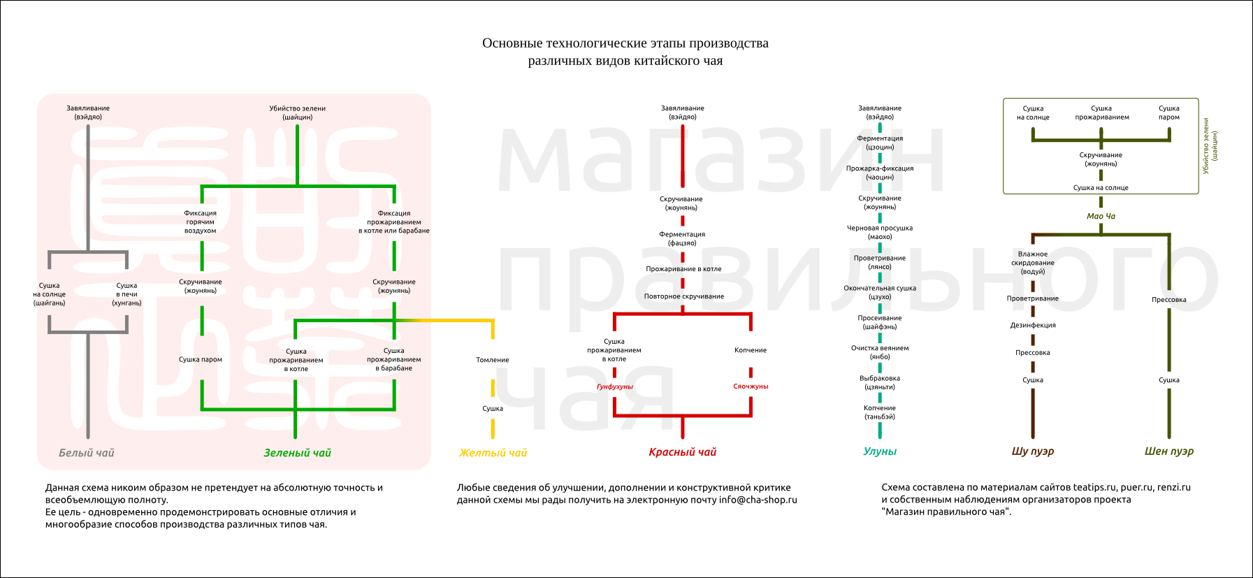 Чай не бывает без обработки. Иначе это не чай, это просто засушенные листья, пить которые нельзя. Обработка - она разная бывает. В подтверждение своих слов, для все неверующих, выкладываю схематическое изображение технологии производства разных видов чая.