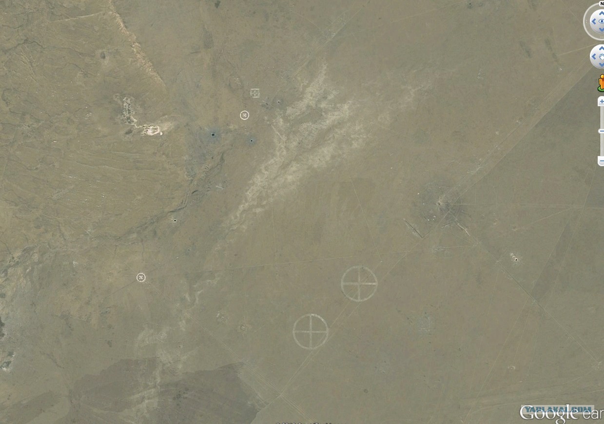 Кусочек Семипалатинского ядерного полигона. Два больших круга с крестами - ориентиры для сброса ядерных бомб, диаметром примерно по 800 метров. Вправо и чуть выше - "вот тут она и бабахнула". Причем 2 раза - в 1949 первая ядерная, в 1953-м первая термоядерная.