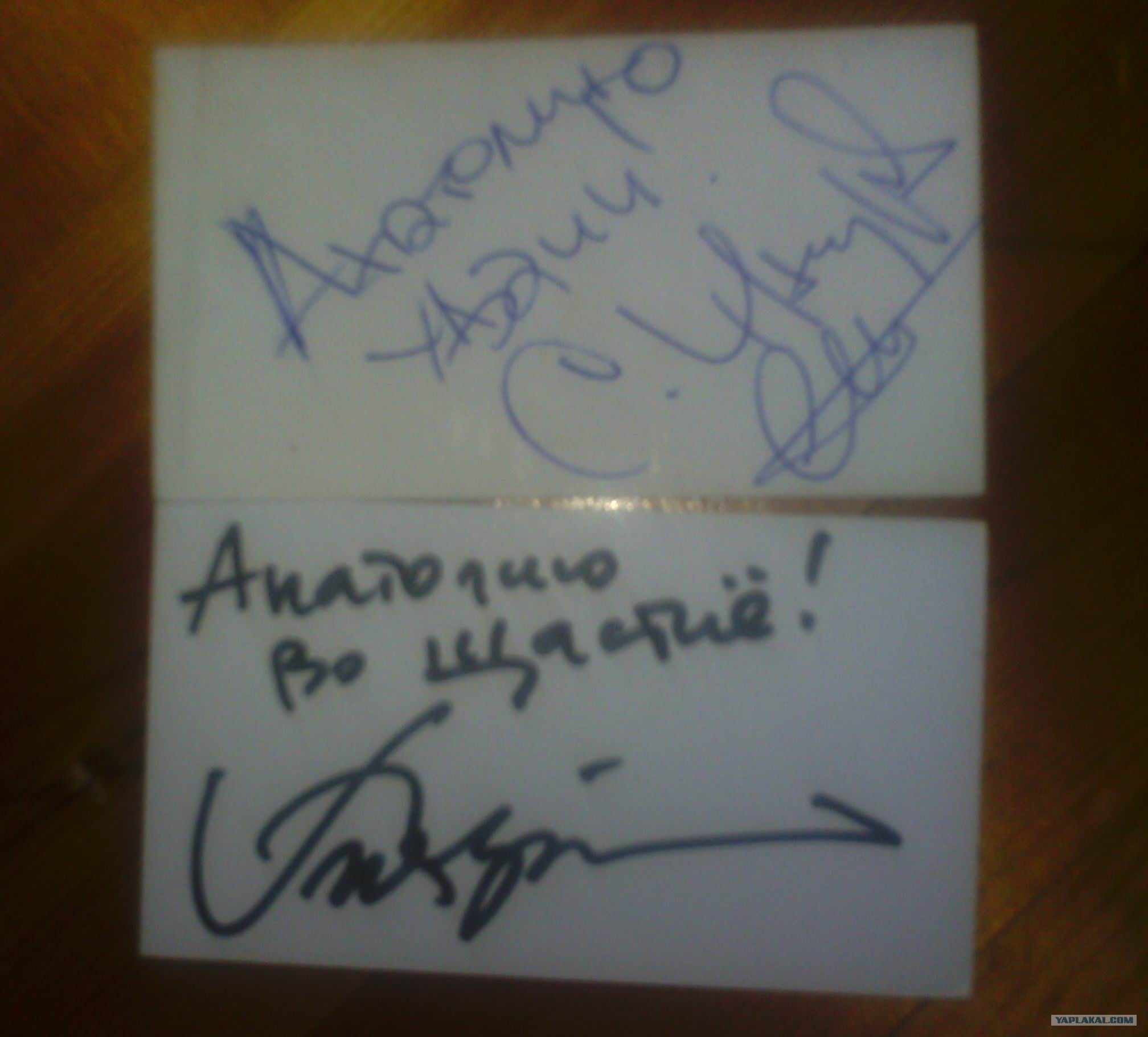 у меня был автограф космонавта Леонова. Подрабатывал после школы на автомойке. Очередь машин, подходит время здорового GMC черного джипа, смотрю - Алексей Архипыч вылезает)