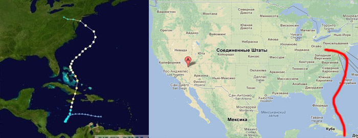 Эта карта показывает многие из природных катаклизмов,которые произошли или еще произойдут в 2012(на момент выхода журнала 5.03.12 года)в мире, в том числе,и тот самый ,ураган.