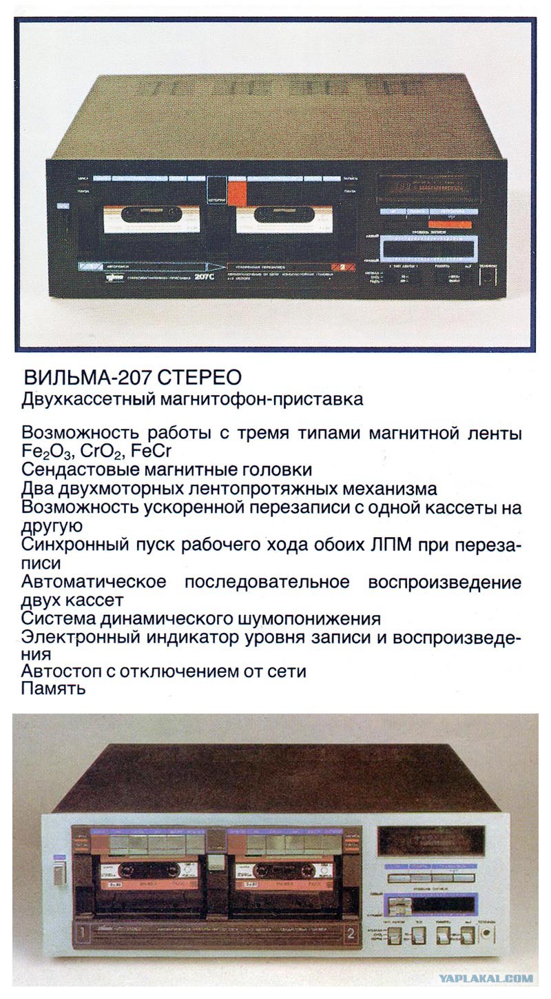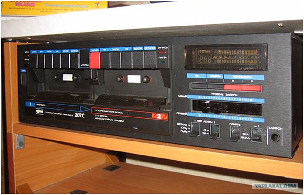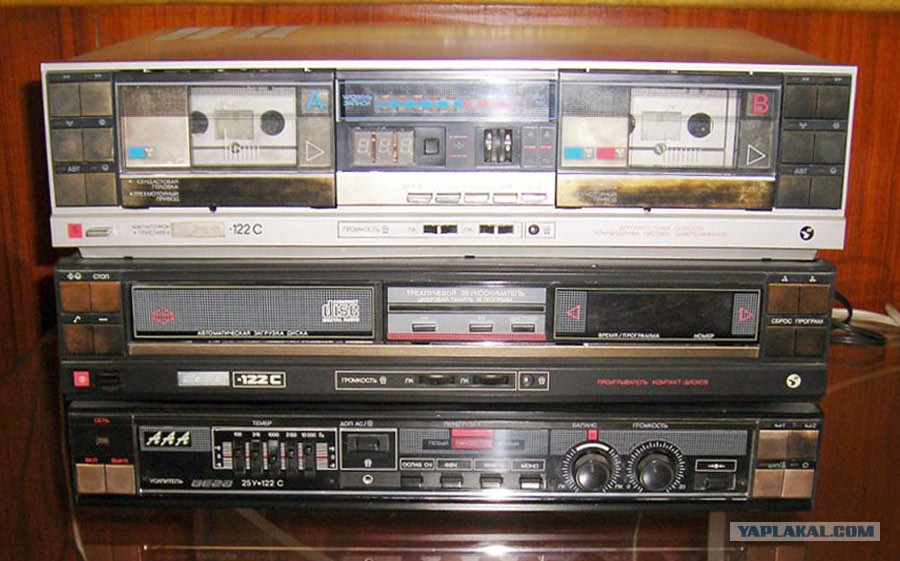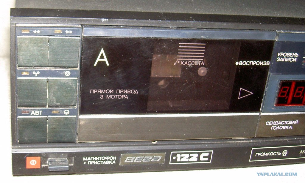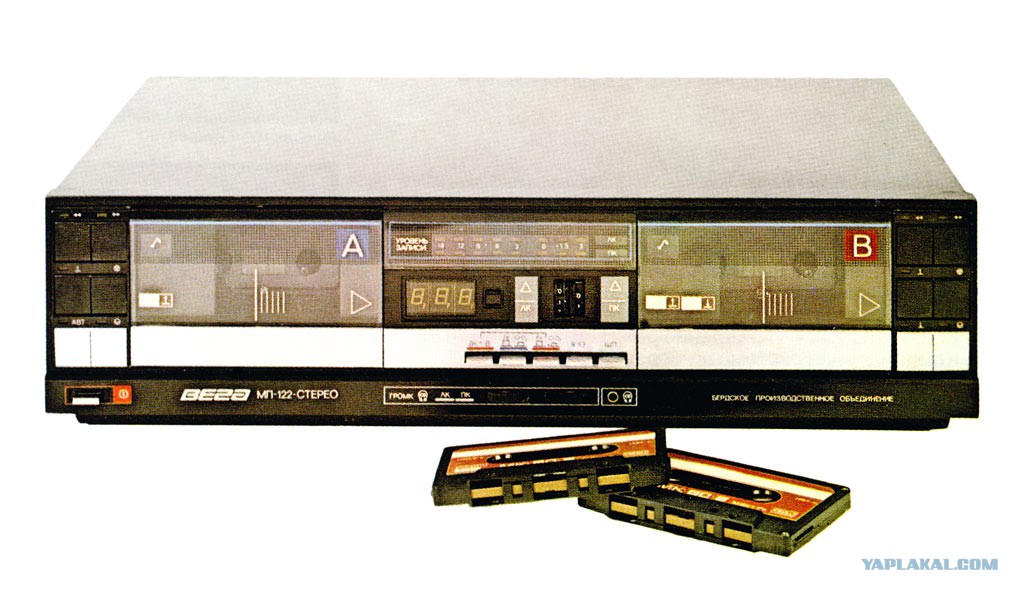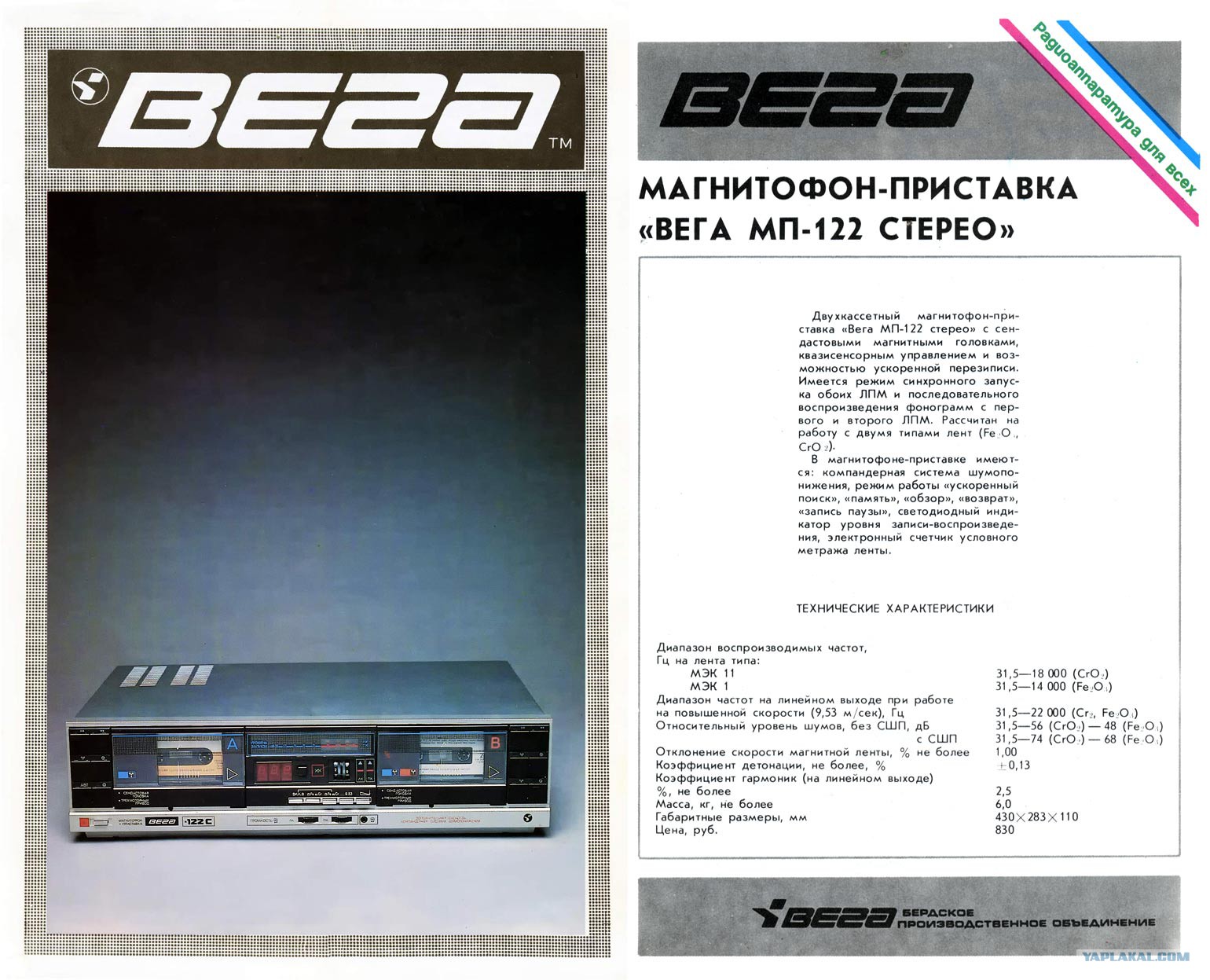 Магнитофон-приставка "Вега МП-122С" с 1987 года выпускалась Бердским ПО "Вега". Двухкассетный магнитофон-приставка ''Вега МП-122 стерео'' имеет два лентопротяжных механизма, обеспечивающих помимо обычной записи и воспроизведения фонограмм их ускоренную перезапись с одной кассеты на другую, а также последовательное воспроизведение записи со второй кассеты, по окончании первой и наоборот. МП снабжён устройством квазисенсорного управления режимами работы, компандерной системой шумопонижения, светодиодным индикатором уровня записи или воспроизведения, электронным счетчиком метража магнитной ленты. В МП установлены сендастовые головки, имеется возможность работы в режимах ''Ускоренный поиск'', ''Память'', ''Обзор'', ''Возврат'' и ''Запись паузы''. Скорость движения ленты 4,76 и 9,53 см/с; коэффициент детонации ±0,13 %; диапазон частот с лентой: МЭК1 - 31,5...14000 Гц, МЭК2 - 31,5...18000 Гц; диапазон частот на скорости 9,53 см/с - 31,5...22000 Гц; относительный уровень шумов без СШП -56/48 дБ, с СШП соответственно 74/68 дБ; коэффициент НЛИ - 2,5%; габариты МП - 430х283х110 мм; масса 6 кг.