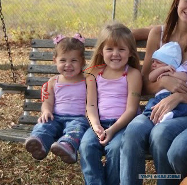 Да блин. Левая рука крайней девочки лежит на коленке у сестры, которая обнимает за плечи крайнюю девочку.