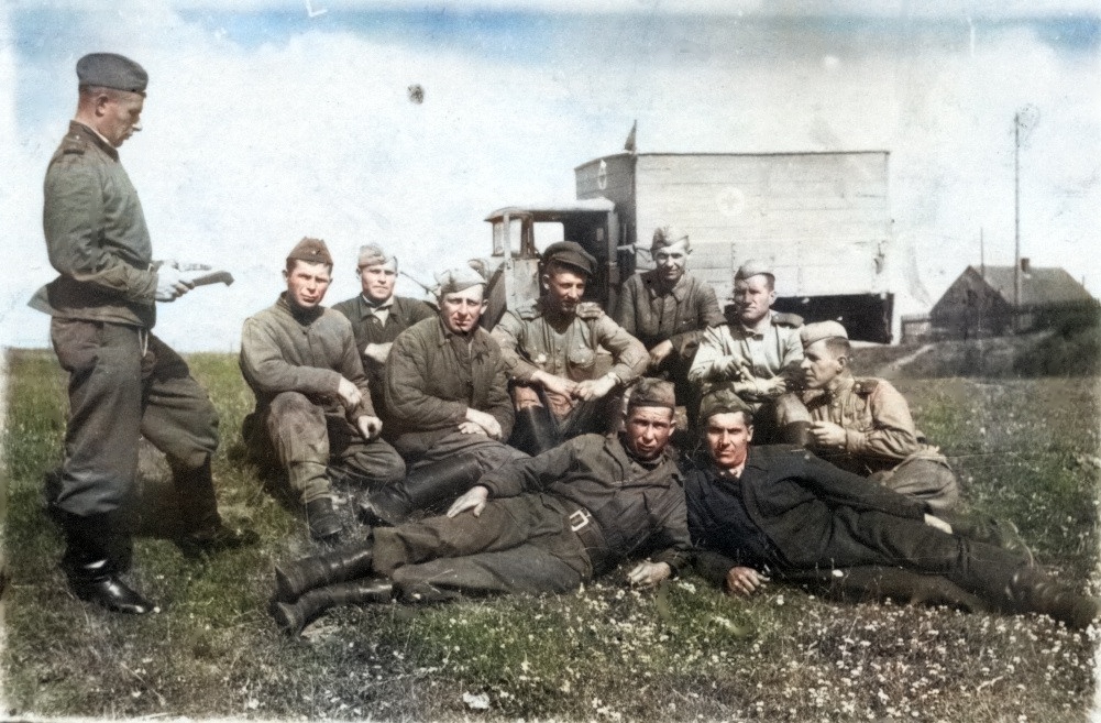 Август 1944. Дед (санитар-шофер полуторки на заднем плане) из сидящих на земле второй слева. 1-й Белорусский фронт, 413 Брестская дивизия, 350-й медсанбат.