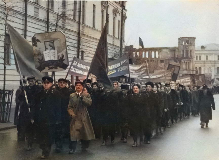 Попробовал городские снимки. Спать сегодня точно не получится. Демонстрация, 7-е Ноября 1957 года. Орел еще в руинах, на заднем плане разрушенное здание гостиницы Берлин (название до 1917 года). 11 Ноября 1941 года эта гостиница называлась "Коммуналь" и была взорвана советскими диверсантами вместе со 150-ю фашистскими офицерами (во время какого то очень пафосного мероприятия по поводу взятия очередного города) . Из останков здания был построен учетно-кредитный техникум.