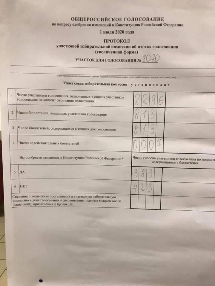 Очень много где проголосовали против поправок либо чуть меньше чем за. Это фотографии протоколов с УИКов ( студенты, в студгородке 70% против),