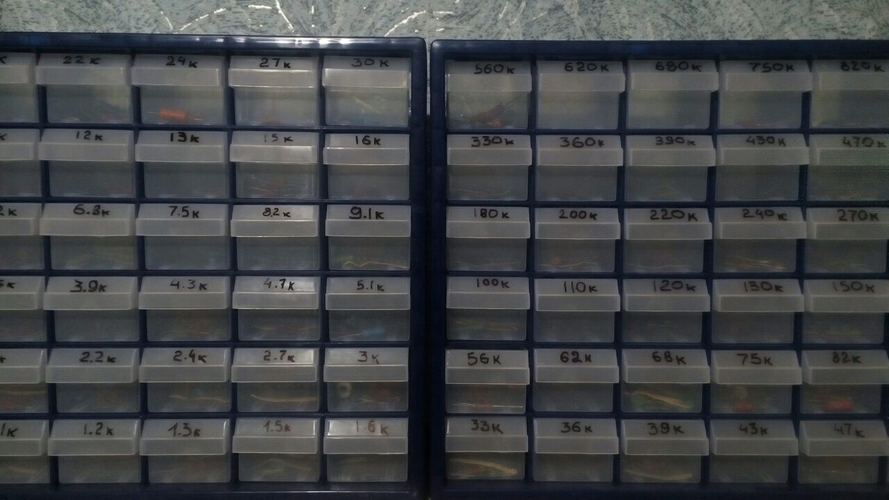 2. Централизованное хранилище резисторов от 10 Ом до 20 мегаом, в ход пошли 72 спичечных коробка. Сейчас коробок спичек стоит около 100 рублей в Магните, соответственно строительство подобного бокса обойдётся в 7200 рублей. Пользуясь случаем, уступлю весь склад за шесть с половиной. biggrin.gif