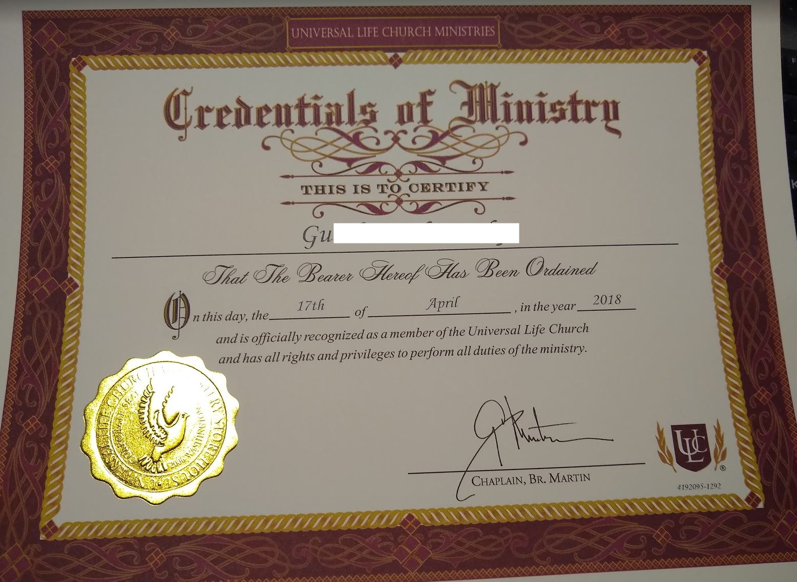 Вот официальная бумага, подписанная Братом Мартином. В уставе этой церкви нигде не указано требование быть человеком. Надо только вести благочинный образ жизни, не грешить. В чем Г. мне поклялся. Грехов за ним нет.