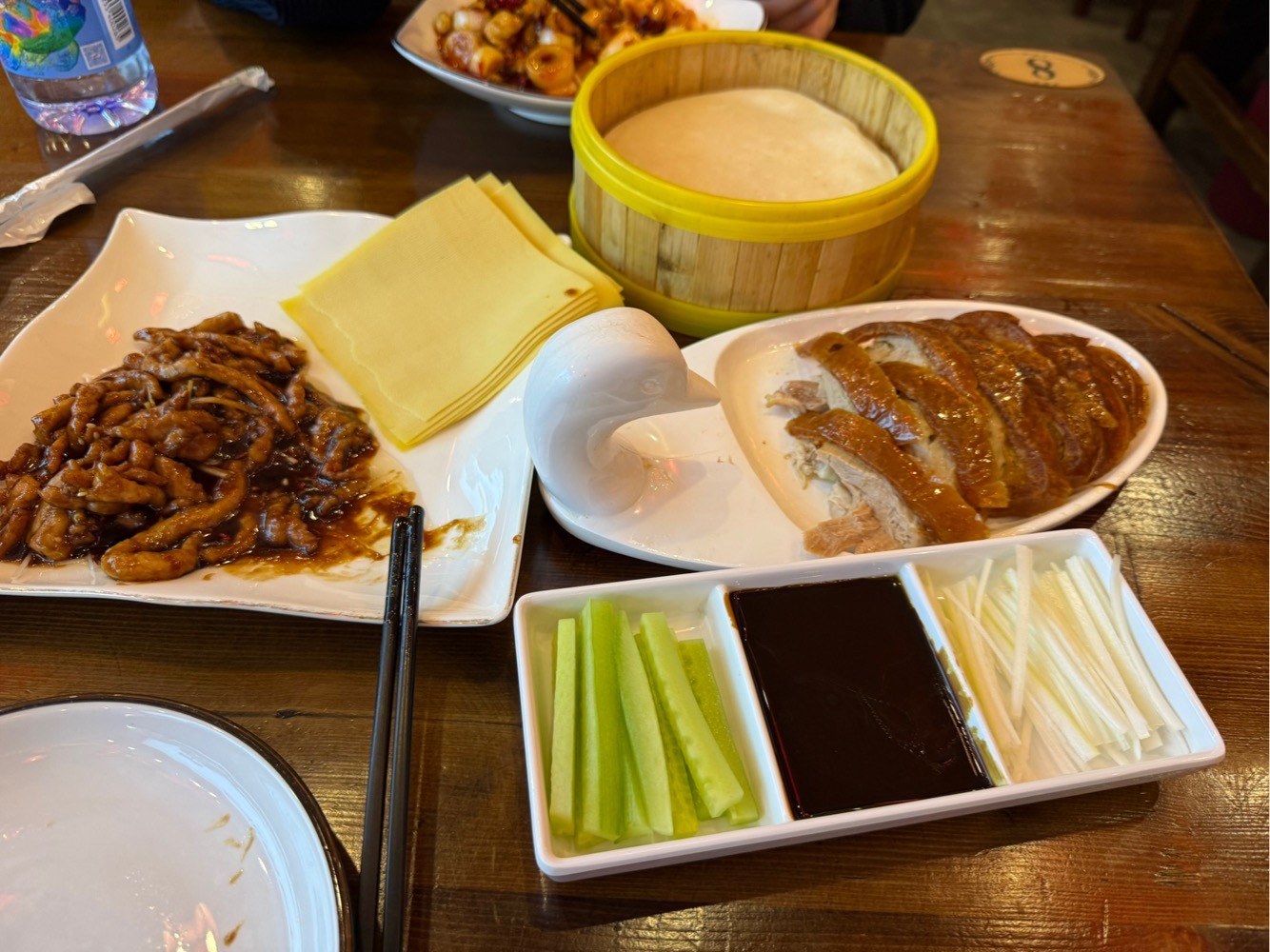 Если честно, то я в Москве не встречал годной утки по пекински. В прошлом году был в Пекине и пробовал ее в месте, откуда она появилась. Это абсолютно другая история. Шкура на утке была миллиметров 5-6 толщиной и по вкусу большего всего напоминала свиные шкварки. Вот фото оттуда, зацените толщину шкуры.