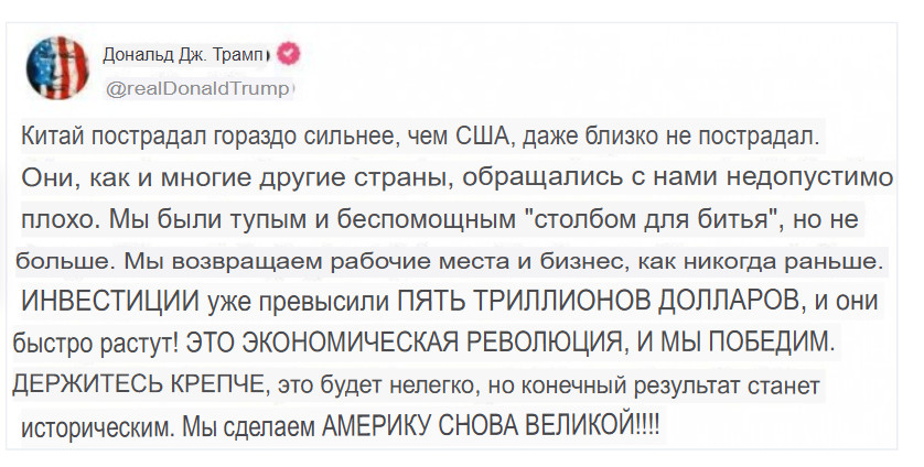 Вот допустим перевёл он предприятия обратно в США, так местным работягам платить надо будет не как китайцам или вьетнамцам. Себестоимость будет конской + наценка + экспортные пошлины. Кто ж этот товар покупать то будет?