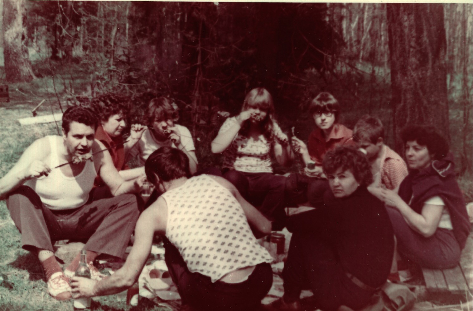 И ведь умудрялись и продукты взять, и в чащу леса углубиться, и костерок запалить, и шашлыки приготовить, пока мы, детвора, горки покоряли! Батя в центре кадра, мама за ним.