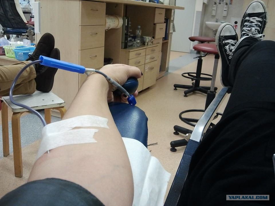 Да, кстати, набор охренительно шикарный. Нам дают шоколадку типа Сникерс, йогурт, маленький сок в пакете и бутылочку воды. Все. Но ведь не пожрать мы туда ходим.... Если деньгами - около 15 евро платят (наверно, точно не знаю, никогда за деньги не сдавала). Больницы покупают одну порцию крови примерно за 70 евро у посредников... Какой-то противный бизнес... Но кровь нужна каждый день, а доноров-волонтеров мало, поэтому больницы не имеют права кривляться и покупают...