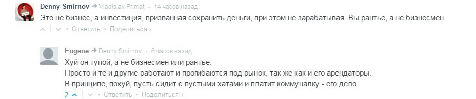 Так его же не винят в том, что у енго 3 квартиры. Хоть 10, если найдешь кому их сдавать по рыночным ценам. Но недочеловек ведь не хочет по рыночным и подбивает других не снижать цены, как то диктует рынок, а войти в сговор и держать ценник. Вот здесь он превращается из человека в мудака.
