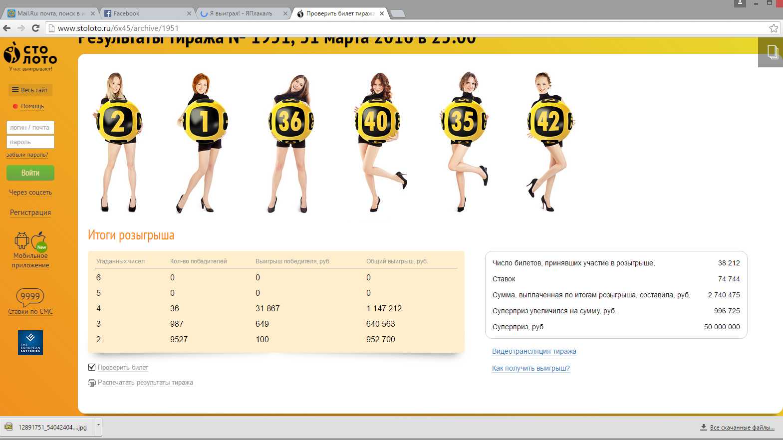 Ребята скорее всего он на самом деле не врёт, так как по информации на официальном сайте гослото есть информация, что 31 марта был разыгран джекпот 50 000 000 р....