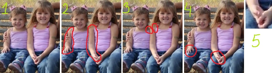 3) рука "прикреплена" к старшей девочке без складок, а с младшей она как-то совсем не вяжется.. на это нам намекает разный цвет кожи и "складка".