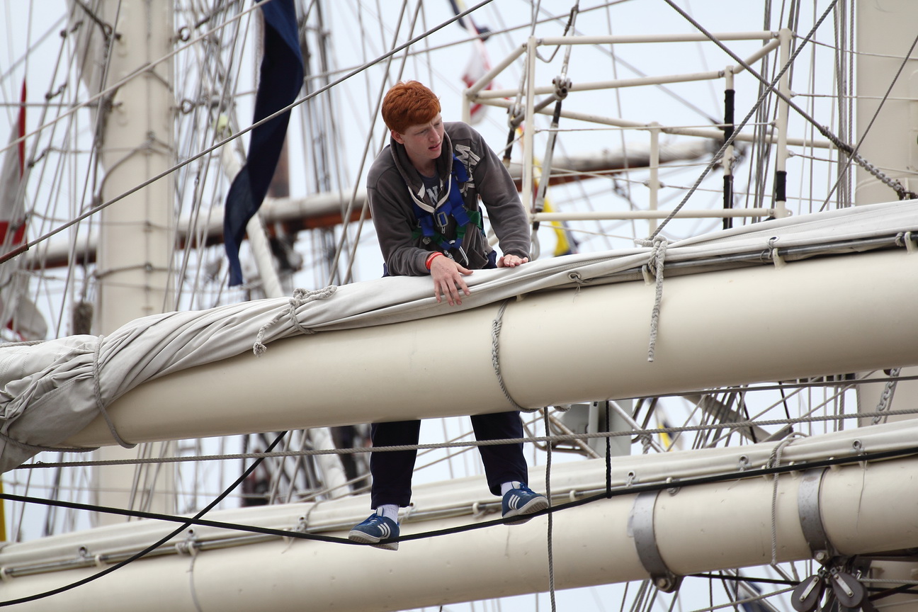 Видит: на рее отсутствуют перты. Это такие горизонтальные канаты внизу рея, по которым морячки перебираются вдоль рея. Без таких пертов травматизм моряков будет около 99%, ибо убирать парус и одновременно цепляться за рей невозможно.
