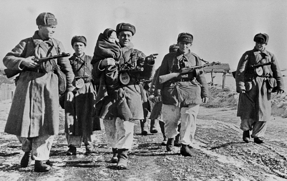 Разведчики 308 артиллерийского полка 33 армии Западного фронта в освобожденной деревне Извеково Смоленской области. Командир отделения сержант Валентин Моисеев с двухлетней девочкой Валей на руках, найденной им с товарищами в одной из изб деревни. Зайдя в пустой дом, разведчики увидели у ножки стола в углу маленькую девочку, которую едва не приняли за куклу.