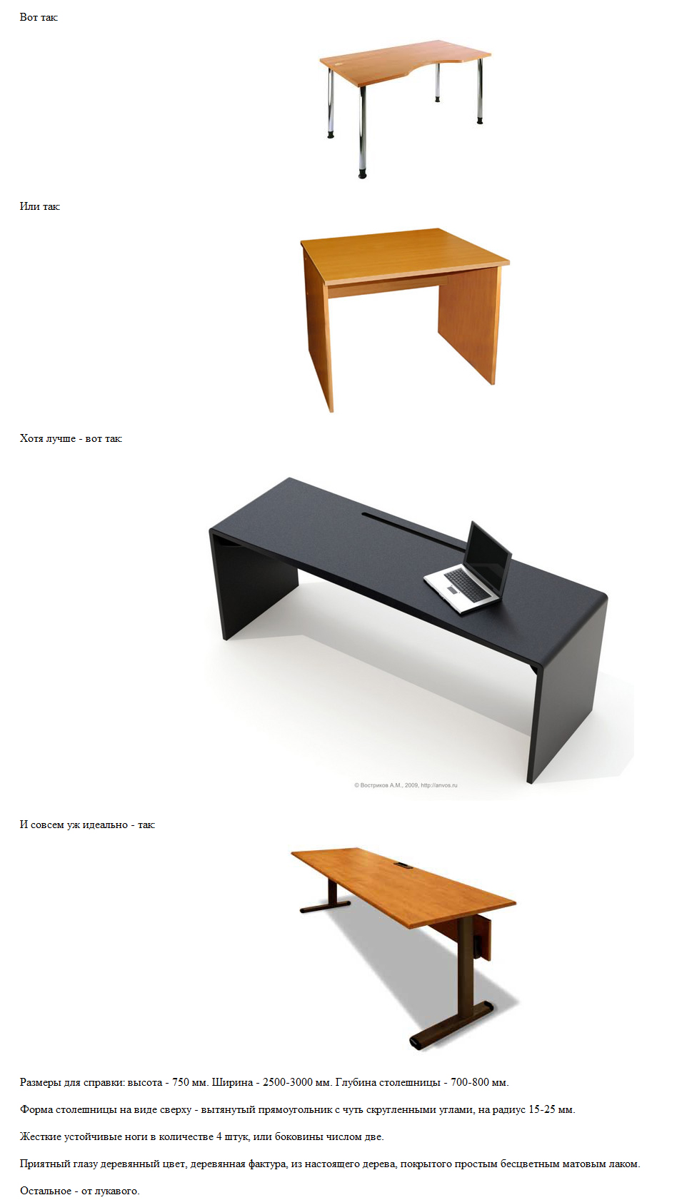 За прямые руки-зелень, а от за сам стол...Ну никак он имхо неудобен для компа. У самого щас уже 3-й стол самодельный..или 4-й..Верхняя кромка монитора на уровне глаз, руки ложатся на клавиатуру без напряжения, подлокотники на уровне клавиатуры, ноги стоят на полу или подставке.А это-обычный письменный стол получился. Туннельный синдром, кстати говоря-штука неприятная, как зубная боль, только в запястье. Сидите за компом правильно...