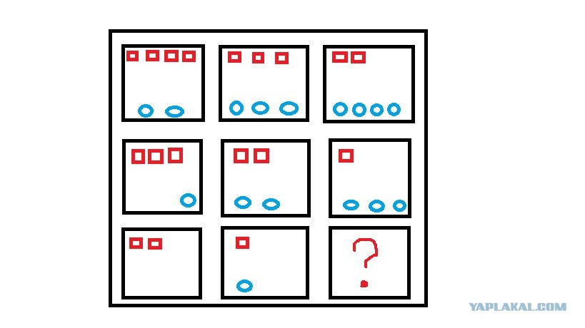 а вот задачка из учебника второго класса в Казахстане, у сына было домашней работой. У нее только один вопрос, что должно быть в квадрате со знаком вопроса. Я то ее решил, но показывал еще 4-5 взрослым людям - все зависли и послали меня на хуй куда подальше с такими задачками, и только один человек справился. Извиняюсь за качество картинки, нарисовал на скорую руку в пэинте.