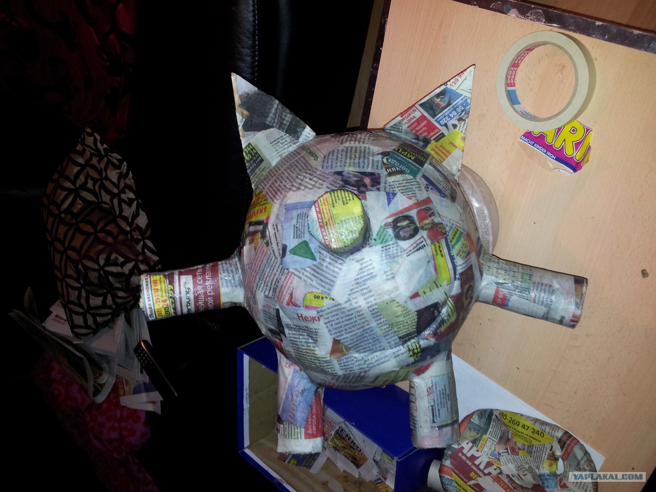 Я тут тоже делала маску, из пластилина сделала слепок моськи своей дочери, а потом бумагу на него клеил, потом водэмульсионка и раскрашивание. И ещё огромную свинью, приду домой сфотографирую.