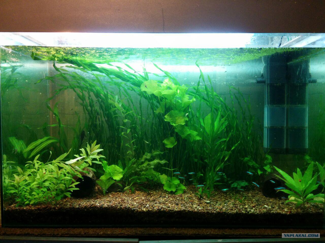 Обьем на 160 л, вода жестковата, но неоны красные и рамирези бабочки вполне комфортно обитали, еще анциструсы пара. Подмена воды по мере испарения, каюсь, грунт не чищу вообще...