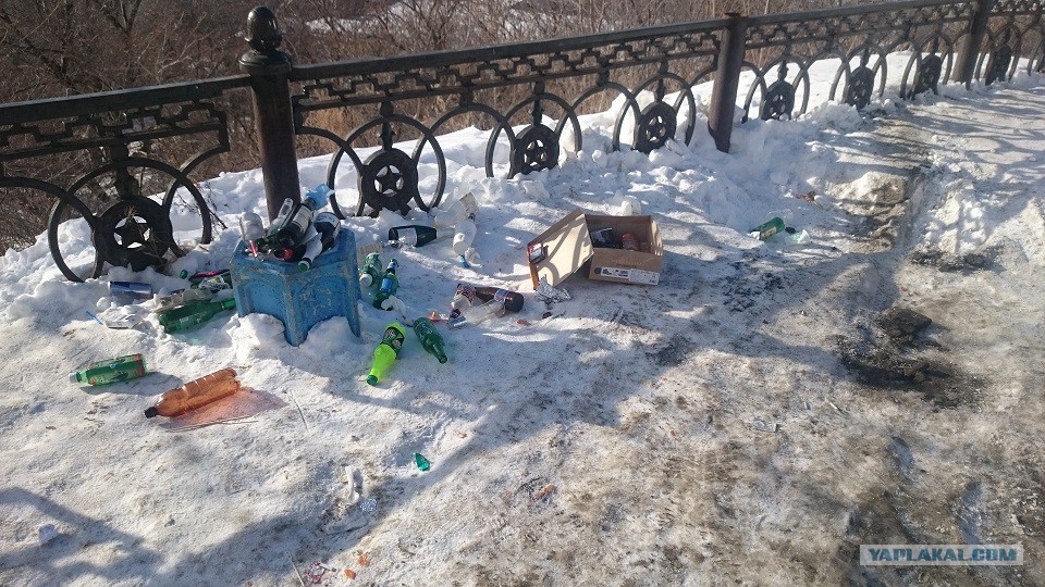 Но вы блядь,можете не расскидывать мусор после себя!!! Просто забрать в пакет гавно,хотя бы свое за собой. Бутылки можно в анальные отверстия рассовывать и тогда может город хотя бы в одном месте чище станет?
