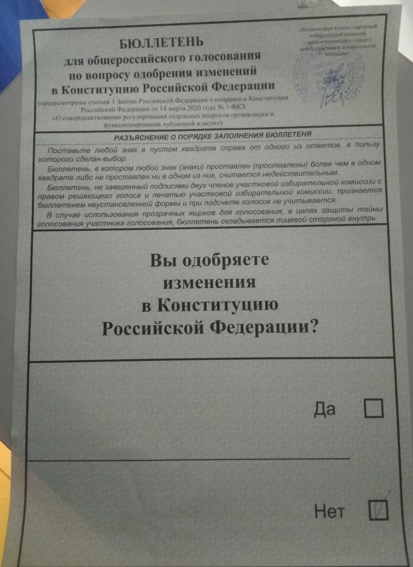 Возложил на всенародное голосование большой и толстый яповский уй. Ибо действо такое законодательством не предусмотрено, а в незаконной деятельности участвовать не намерен. А проходя мимо школы, где народ волеизъявлялся (за пивом) был шокирован тем, что пенсионеры, которые с трудом передвигаются, ковыляли таки голосовать за поправки. Не смотрите телек, товарищи, иначе ваш моск засрут как у них....