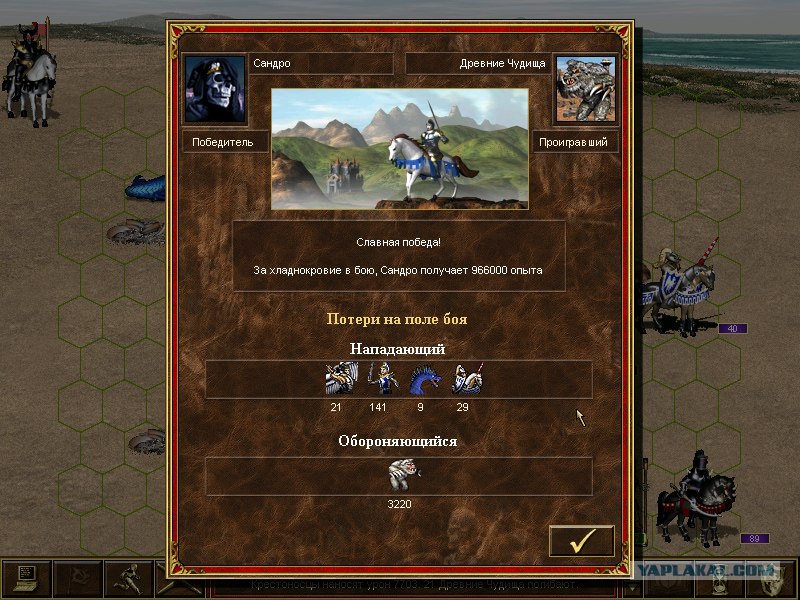 У ТС артефакт доспехи проклятых, они кастуют перед битвой всякую бяку на противника, в том числе и медлительноть. И если не ошибаюсь, собран плащ вампиров, что дает некромантеру при прокаченном скиле воскрешать не скелетов, а личей (посмотрите на их количество). Пройни мимо было нельзя, так для сбора могучей кучки в своей армии некроманту надо биться со всеми. А убить этих гопников 7лвл при мастере уровня земли не составляет большого труда!