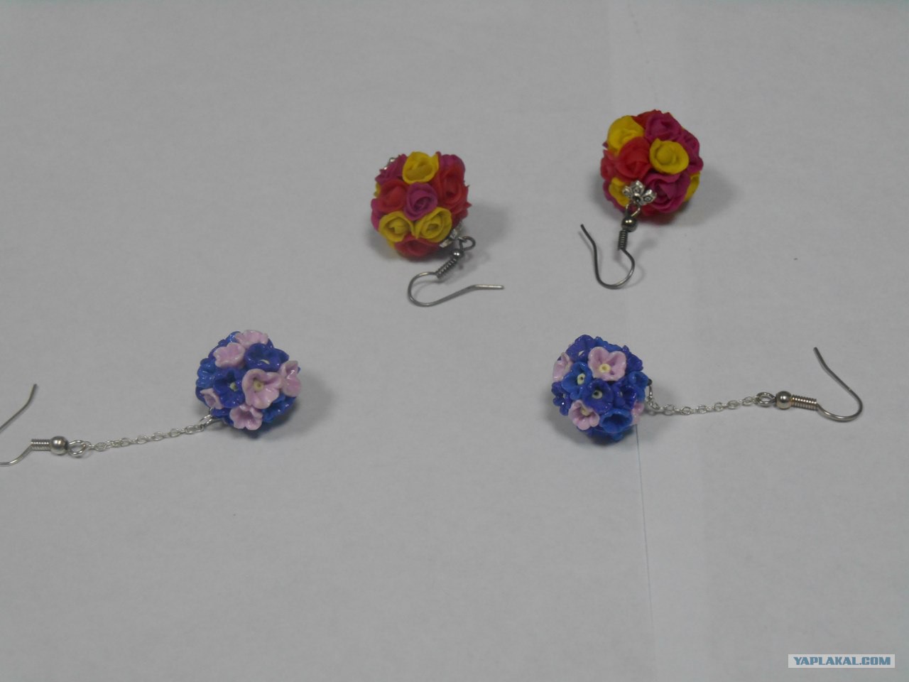 Серьги с цветочными шарами классные. Представляю, сколько труда ушло на то, чтоб вылепить такие малюсенькие цветочки! У меня на такое ни сил, ни терпения не хватит никогда, так что леплю, что покрупнее.