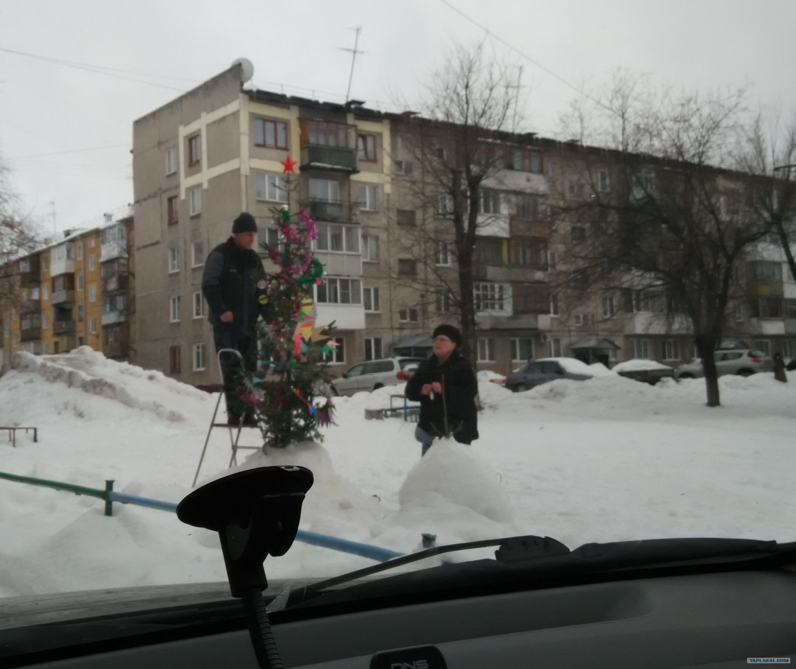 Сегодня проезжал по двору и меня просто умилила картина, как дедушка с бабушкой наряжали елку во дворе.