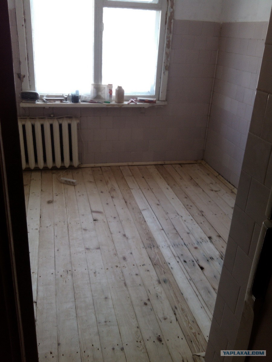 После этого я открутил и выкинул все дверки шкафов... Потом вообще эту кухню из опилок. Купил плахи карельской лиственницы 50, 80, и 100мм толщиной... Сейчас делаю, но без дверок, только мощная столешница на 100, полки...
