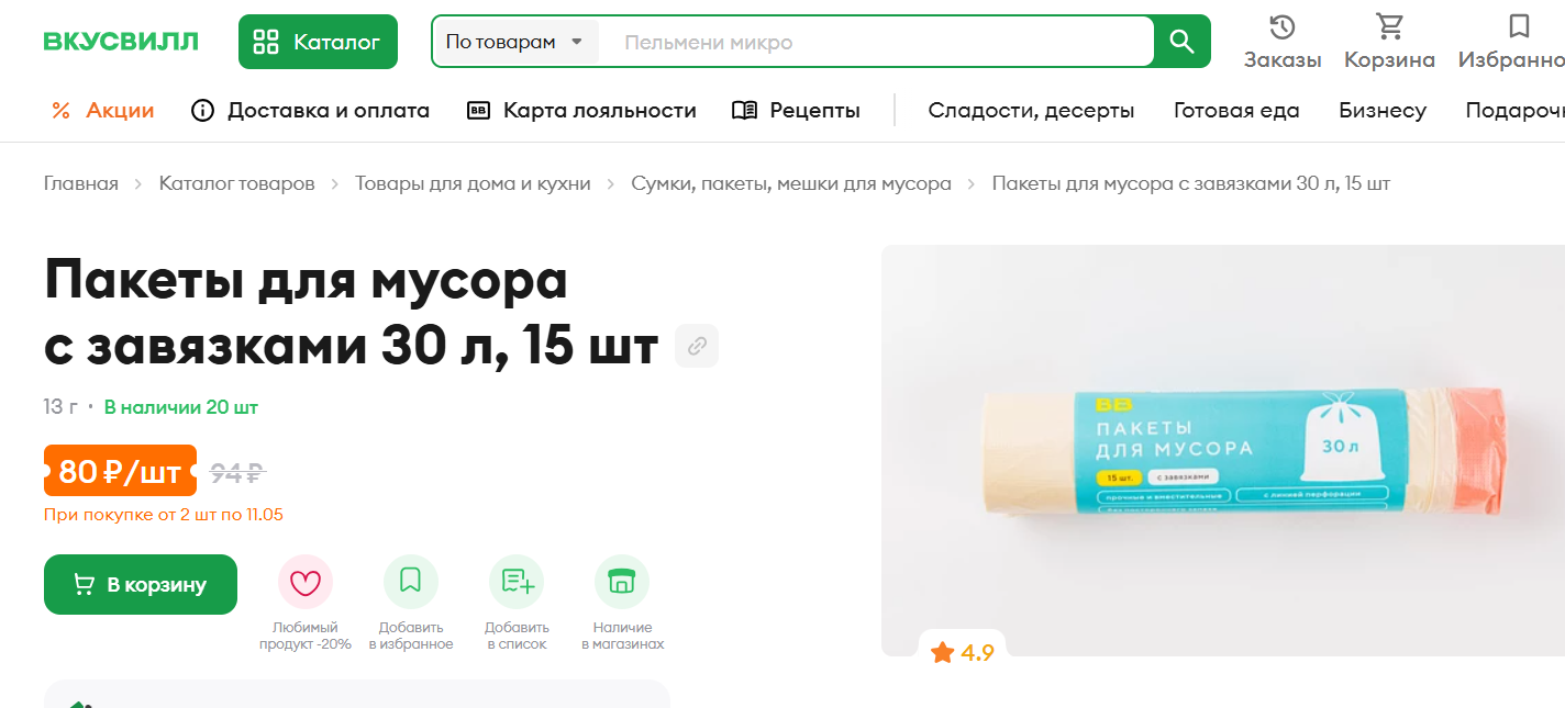 Пакеты для мусора из Вкусвилла ~5р за штуку