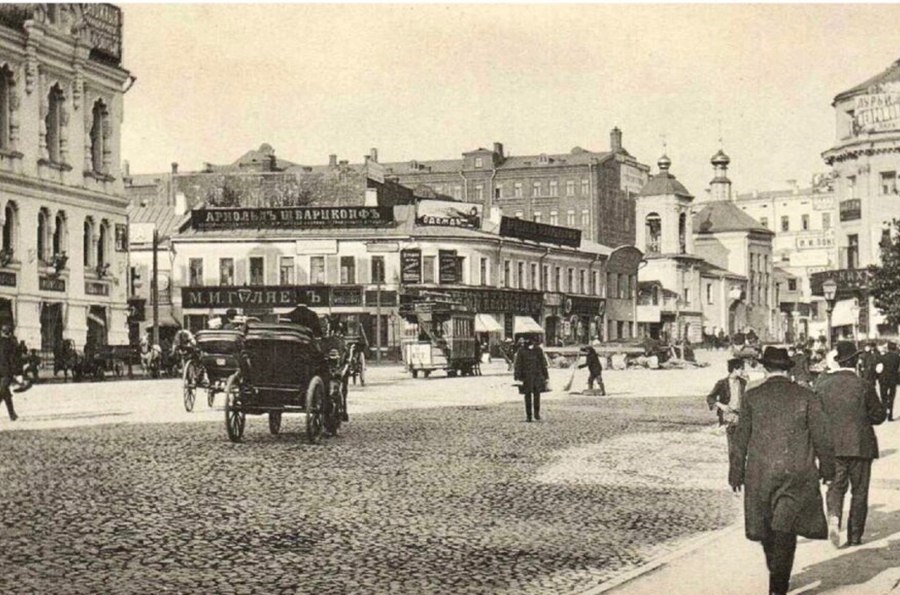 Слева Третьяковский проезд и его ворота. На месте владений купца Челышева - Гостиница Метрополь. «Челыши» здесь стояли до 1898 г. Гиляровский писал: «Теперь на месте «Челышей» высится огромное здание гостиницы «Метрополь», с ее разноцветными фресками и «Принцессой Грезой» Врубеля, помогавшего вместе с архитектором Шехтелем строителю «Метрополя» С. И. Мамонтову.