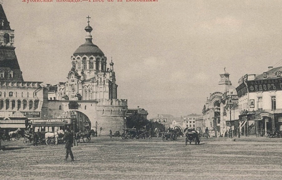 Театральный проезд. Слева Третьяковский проезд и его ворота. На месте владений купца Челышева - Гостиница Метрополь. «Челыши» здесь стояли до 1898 г.