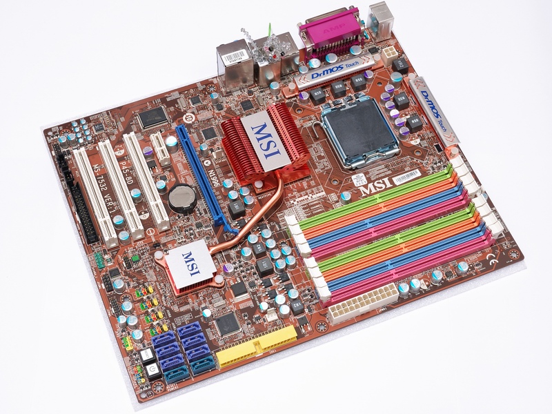 Не шедевр, но тож не самая нормальная мать MSI P45-8D аж с восемью слотами под память. 4xDDR2 и 4xDDR3, ясен пень, что-то одно на выбор.