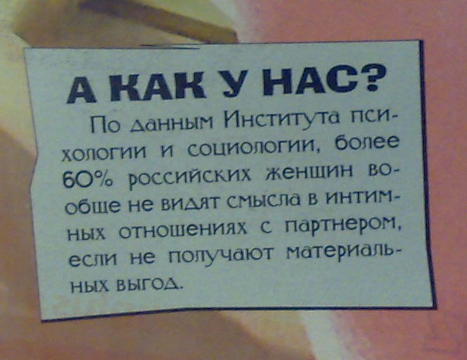 Несколько удивлен... Впервые??? Или на ЯПе мало топиков с подобными фактами? Девушки давным давно уяснили себе цену. Только вот для многих она явно завышена...